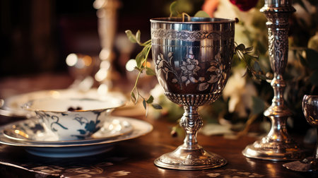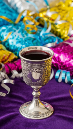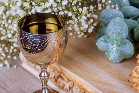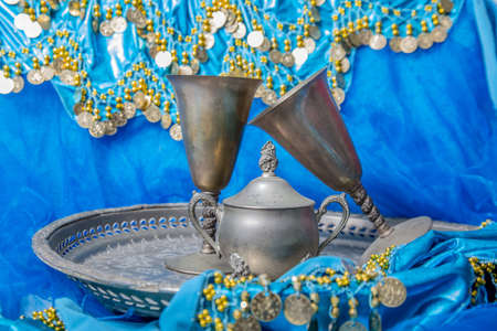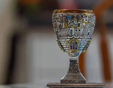 Traditional, decorative Jewish kiddush cup. Silver cup with saucer filled on a blurred background. Nobody, selective focus, blurred.