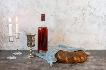 Shabbat Shalom - challah bread, shabbat wine and candles on gray background. Side view. With copy space.