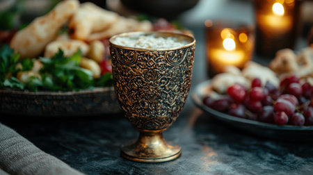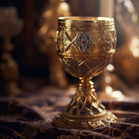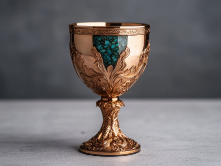 Golden Goblet with Symbolic Engravings on Display. Concept of Cultural Heritage, Artistic Design, Decorative Art. Purim. Vertical.