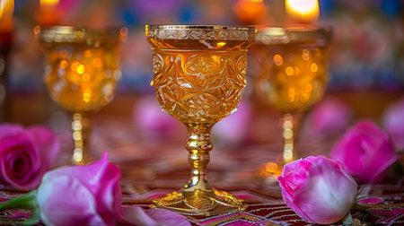Three Golden Goblets with Ornate Design on Table with Pink Roses and Lit Candles In Background