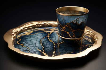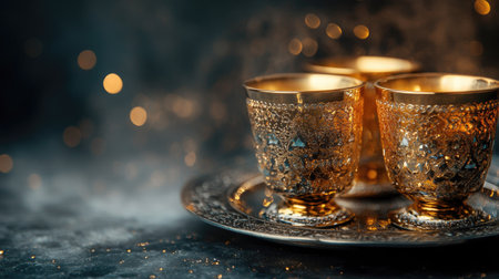 Discover a stunning still life featuring elegant golden tea cups on a decorative tray, exuding warmth and luxury. Perfect for festive occasions.
