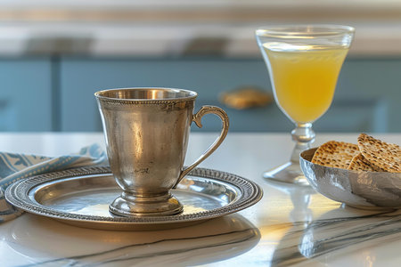 Depicting a silver cup, a silver plate, a bowl of matzoh bread and a napkin