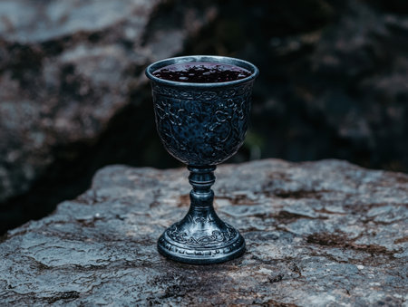 Ancient goblet, etched with intricate patterns, bestows limitless liquid to its possessor A magical scene captured in a realistic image with a chromatic aberration effect , Rear view