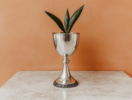 A golden cup is placed on top of a wooden table, catching the light and creating a warm, inviting ambiance in the room. The intricate patterns on the cups surface gleam, adding an elegant touch to the simple setting.