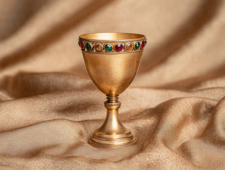 Ornate golden chalice with gemstone accents on a gold fabric background
