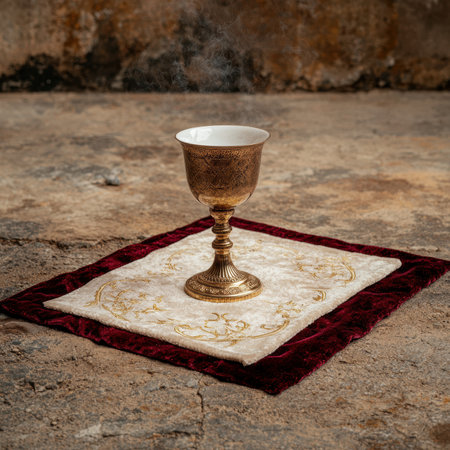 Ornate golden chalice on a decorative cloth with smoke rising.