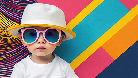 This image is a pop art painting of a baby wearing sunglasses and a hat, with a copyspace for text on the right side. The baby has a confident and cool expression, while the background is filled with bright colors and geometric shapes. This image is inspired by the pop art movement of the 1950s and 1960s, which used bold and vibrant imagery to challenge the traditional notions of art. This image can be used for various purposes, such as advertising, editorial, social media, or personal projects, to convey a sense of fun, creativity, and style.