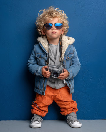little boy with blonde hair laugh with retro camera.