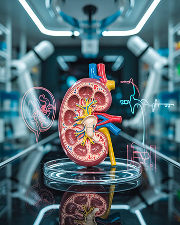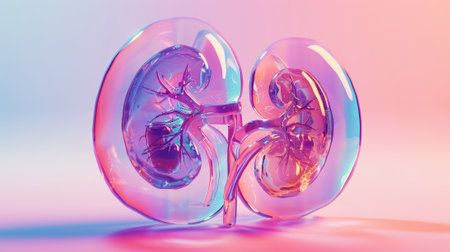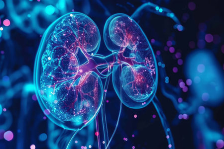 3D rendered image of a human kidney with detailed anatomy glowing against a dark blue background with floating particles, suitable for medical and educational content