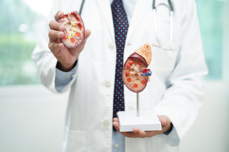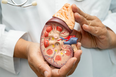 Healthcare professional holds kidney model to explain organ functions during a medical consultation in a clinic setting