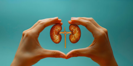 Hands forming protective gesture around a 3D model of kidneys against a turquoise background, symbolizing health, .