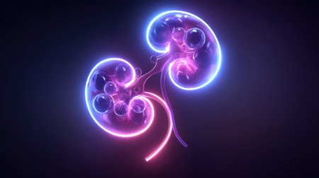 This vibrant and glowing abstract representation of human kidneys highlights their intricate structure in a captivating design. The use of neon colors adds a modern touch to the depiction, suitable for healthcare and educational themes.