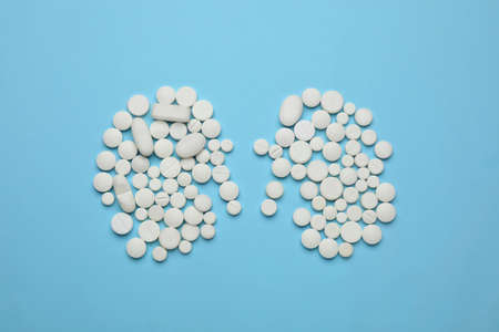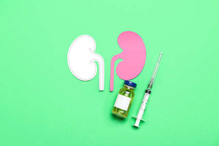 Anatomical model of human kidney and with pills in the clinic. Treatment of kidney disease and pills for kidneys and drugs for treatment