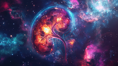 An artistic representation of a kidney in a cosmic setting. The vibrant colors and nebulae create a surreal and beautiful image.