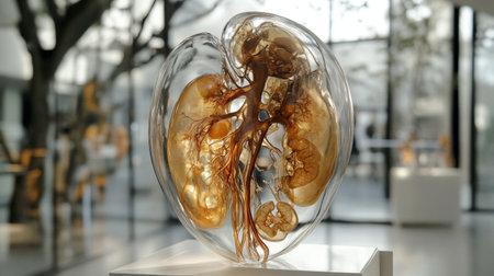 Explore a detailed and transparent model of the human kidney, showcasing intricate anatomy in a modern exhibition space. Ideal for educational purposes.