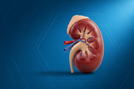 3D illustration of a human kidney with adrenal gland and detailed blood vessels, displayed on a blue medical background, ideal for healthcare and anatomy education content.