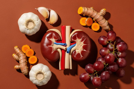 Medical concept showing human kidney model surrounded by garlic, turmeric, and grapes on a brown background, symbolizing nutrition, detox, and kidney health support.