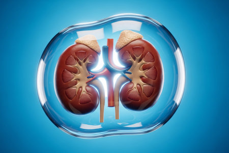 3D illustration of human kidneys enclosed within a transparent water bubble on a blue background, symbolizing organ protection, hydration, and medical health concepts.