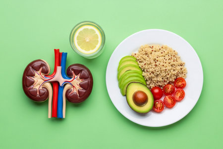 Conceptual image of a balanced kidney-friendly diet featuring avocado, quinoa, spinach, and tomatoes with lemon water, symbolizing nutrition and renal health care.