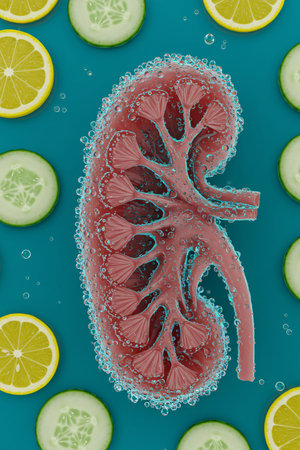 3D kidney model submerged in water with fresh lemon and cucumber slices on blue background, symbolizing hydration, detox, healthy lifestyle, and kidney care nutrition.
