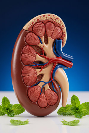 Detailed anatomical kidney model showing internal structure, veins, and arteries with mint leaves at the base, symbolizing kidney health, wellness, and medical education.