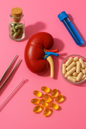 Creative medical and lifestyle composition showing kidney model with capsules, supplements, lab tube, yoga mat, and detox water, symbolizing kidney health and wellness care.