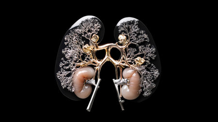 Highly detailed kidney with arteries and veins displayed on dramatic dark backdrop