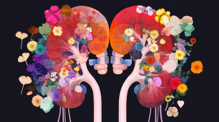 This artistic illustration presents human kidneys entwined with a vibrant assortment of flowers, symbolizing health and wellness. The colorful design captures the beauty of nature while exploring themes of life's balance and organic growth, ideal for health-related content.