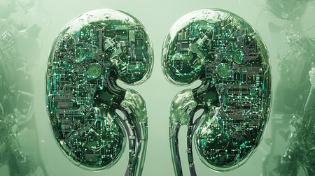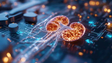 A pair of futuristic cybernetic kidneys with intricate green circuitry, symbolizing advanced bioengineering, artificial organs, and medical technology innovation.