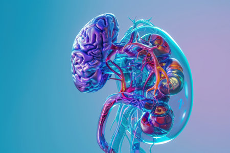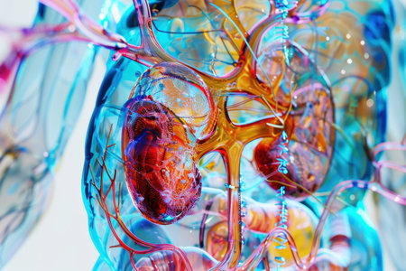 3D rendering of a human kidney with arteries and veins displayed on a colorful gradient background, ideal for medical education, healthcare design, and anatomy presentations.