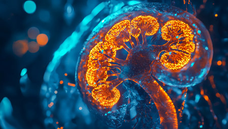 Glowing 3D kidney visual in clinical precision, surrounded by shadows