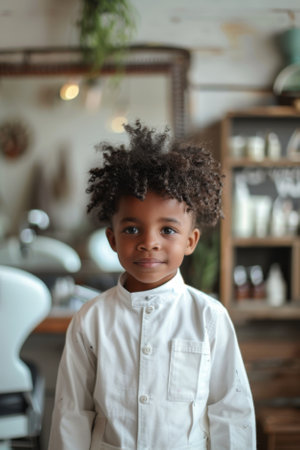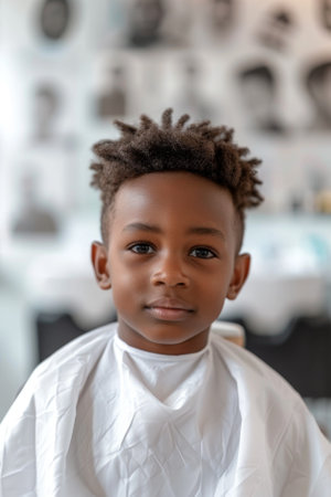 Portrait of little African-American boy sitting in barber shop