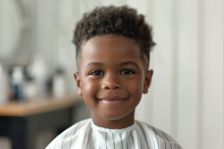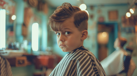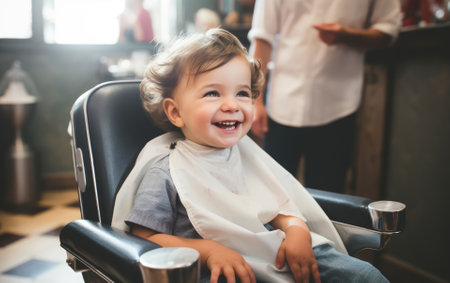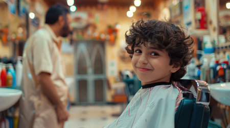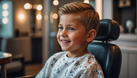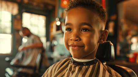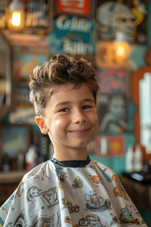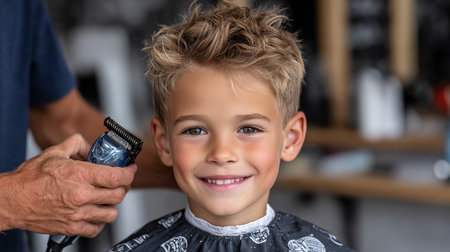 A Smiling child enjoys a stylish haircut at a traditional barbershop with vintage aesthetics
