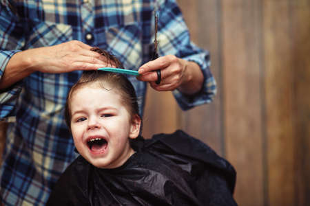 Little boy gets his hair cut with a pair of barber scissors. Close-up of woman hands grooming kid boy hair in barber shop. Portrait of male child at the barber shop to cut his hair.