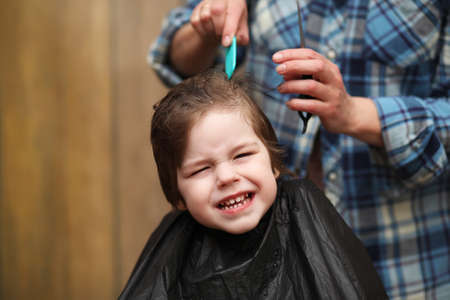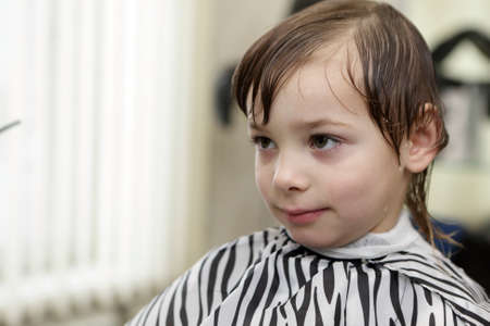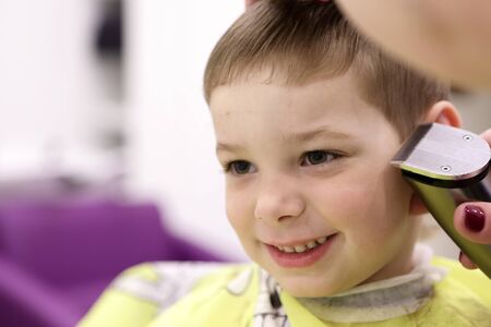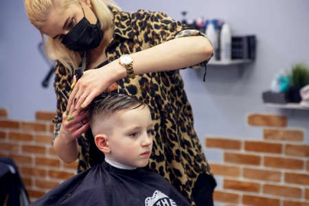 A little cute boy sits in a hairdresser's at the stylist's, a schoolchild is getting hair cut in a beauty salon, a child at a barbershop's, a short men's haircut.