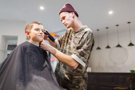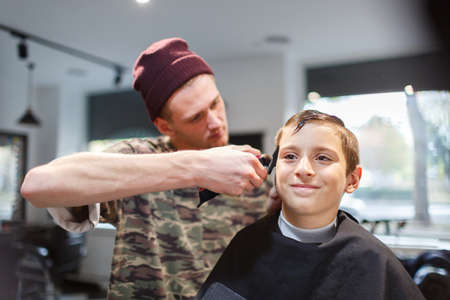 Hairdresser in barbershop makes a haircut for a young guy