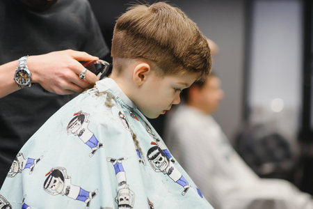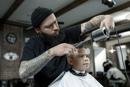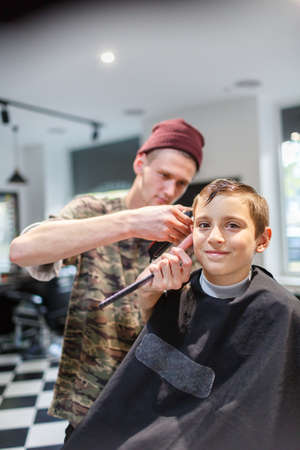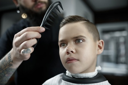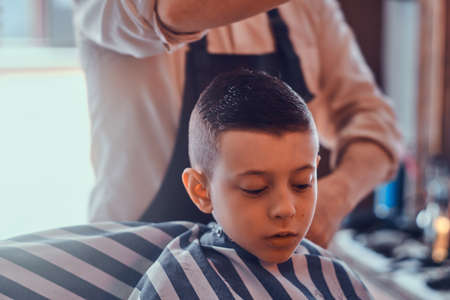 Calm little school boy is preparing for the school at trendy barbershop with mature hairdresser.