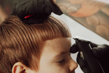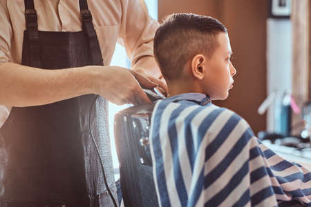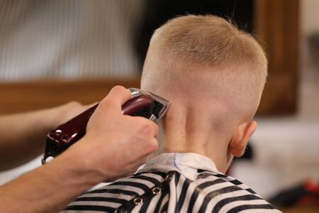 Mens hairstyling, haircutting, in a barber shop or hair salon. Close-up of man hands grooming kid boy hair in barber shop. Boy cut with hairdressers machine.