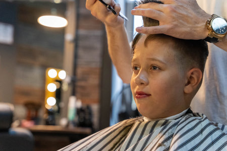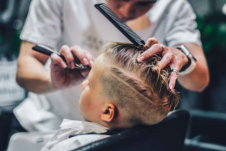 Closeup of boy having haircut with comb and scissors at barber shop