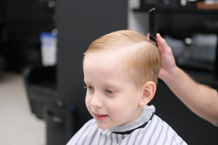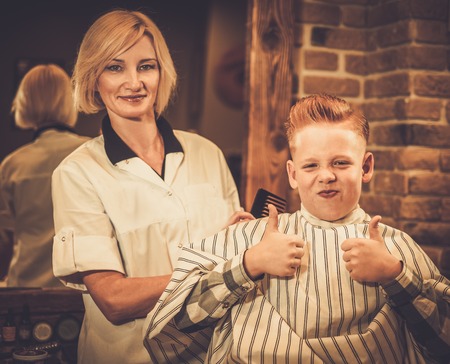 Blond boy getting stylish haircut in barbershop