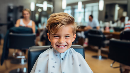 Boy sitting in hairdressing salon in chair with beautiful haircut. Generative AI illustration