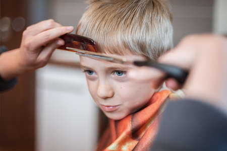 A blond boy of 8 years old gets his hair cut with scissors. Hairdresser services at home. Haircut for a child with blond hair