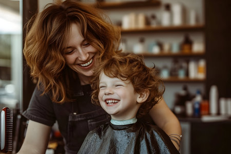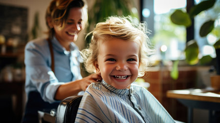 In a cheerful salon, a child enjoys their haircut, laughing joyfully with the hairstylist at their side.