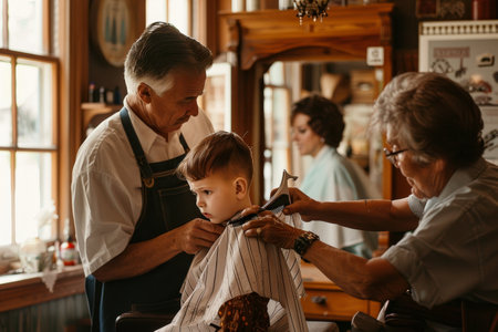 A young boy sitting in a barber chair getting his hair cut by a barber in a local shop, A barber giving a young boy his first haircut, surrounded by supportive family members