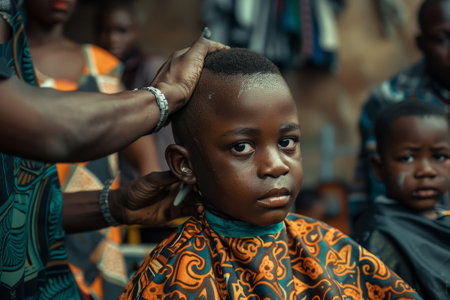 A man carefully trims a young boys hair in a busy barber shop, A barber giving a young boy his first haircut, surrounded by supportive family members