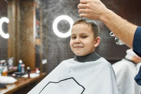 Barber's hands spray the little boy's hair with a spray gun. Close-up of woman hands grooming kid boy hair in barber shop. Portrait of male child at the barber shop to cut his hair.