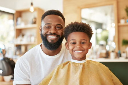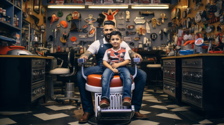 Father and son bond during a barber shop visit enjoying family time and connection.