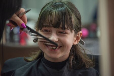 hair salon concept. Girl bang bang in a beauty salon. A child in the barber cuts his hair.