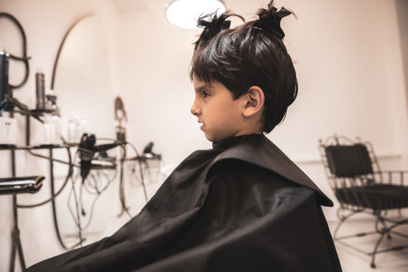 Adorable kid excited about new haircut. Little boy first time in barbershop. Cute client waiting for hairdresser.