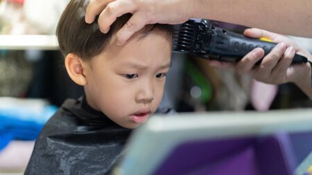 Caucasian boy getting haircut in barbershop indoor